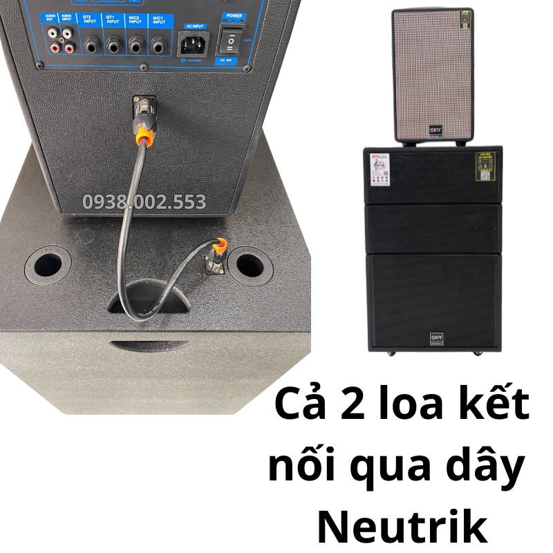 Loa kết nối với nhau thông qua dây Neutrik để tạo ra chất âm hay và công suất lớn nhất có thể để phục vụ nhu cầu ca hát nghe nhạc. Nếu các bạn muốn mang loa đi chơi du lịch, có thể tháo rời loa nhỏ phía trên và sử dụng như 1 chiếc loa thực thụ.Với bình Acquy 12v 24Ah thời lượng sử dụng của cả 2 loa khi kết nối từ 4 - 8 tiếng tùy công suất, còn chỉ sử dụng 1 loa trên thì thời lượng sử dụng khá là lâu.