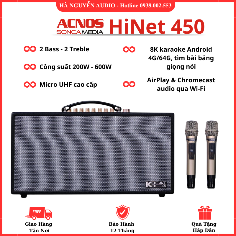 Loa karaoke xách tay Acnos Hinet 450 đã được nhà Acnos nghiên cứu và phát triển nâng cấp để có thể tạo ra chiếc loa phục vụ đầy đủ nhu cầu ca hát nghe nhạc.
