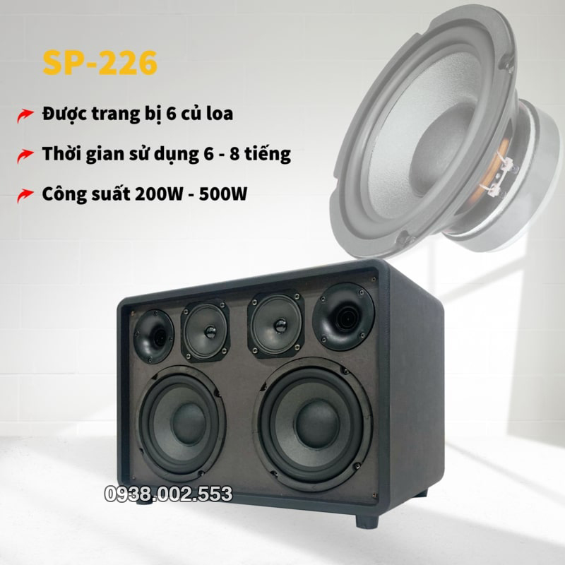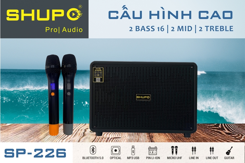 Với cấu hình 3 đường tiếng gồm 6 củ loa, loa Shupo SP 226 mang đến một hệ thống âm thanh tinh tế. 2 loa bass 16 với màng cao su cung cấp âm trầm mạnh mẽ và sâu lắng, trong khi 2 loa mid và 2 loa treble giúp tái hiện lời hát trung thực và âm cao trong trẻo. Điều này tạo nên âm thanh cân bằng, sống động, phù hợp với mọi phong cách âm nhạc.
