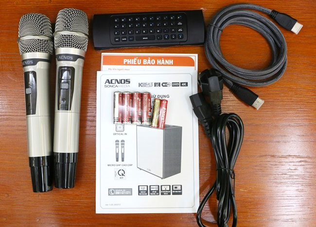 – Phụ kiện tiêu chuẩn kèm theo máy: 2 Micro nhôm không dây UHF (kèm 4 pin AA), Dây nguồn AC, Remote tìm bài hát bằng giọng nói (kèm 02 pin AAA), Dây HDMI, Phiếu bảo hành, Sách hướng dẫn sử dụng.