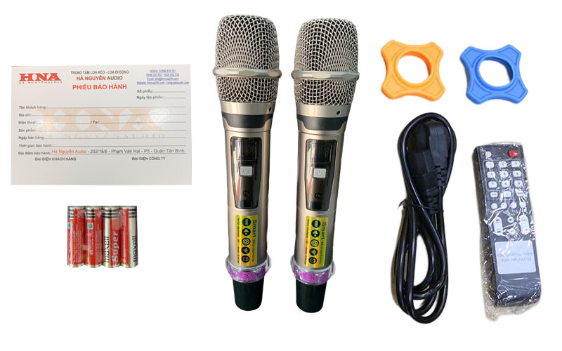 Phụ kiện : 2 micro không dây, 1 dây sạc, 1 remote