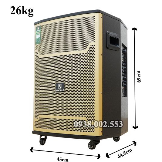 Loa kéo Nanomax SK-15X3 không chỉ là một sản phẩm âm thanh tuyệt vời mà còn có thiết kế ê căng kim loại màu vàng đẹp mắt. Với kích thước (45.5 x 45.5 x 69)cm và trọng lượng 26kg, sản phẩm này không quá to lớn và có thể dễ dàng đặt bất cứ đâu. Đặc biệt, loa kéo Nanomax SK-15X3 được trang bị bánh xe và tay xách, giúp bạn di chuyển sản phẩm đi hát ngoài trời, tổ chức tiệc tại nhà hoặc mang đi du lịch mà không phải lo lắng về việc mang theo một thiết bị âm thanh quá to lớn và nặng nề.