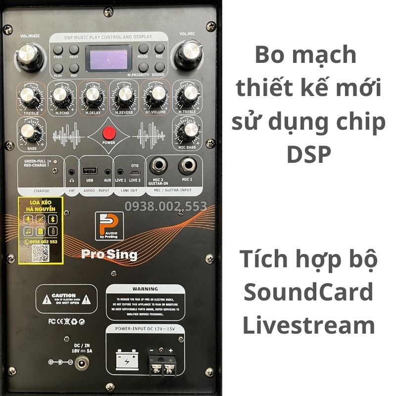 Loa Karaoke Prosing DSP - Super được tích hợp CPU DSP bên trong board Bluetooth, Guitar Input .. kết hợp với giao tiếp EQ của Micro (gồm Delay, Echo, Reverb), và công suất loa sử dụng 3 X IC Infineon cùng khả năng chống nhiễu ngõ ra mang đến những trải nghiệm âm thanh Karaoke tuyệt vời nhất cho những Khách Hàng đam mê âm nhạc và ca hát.