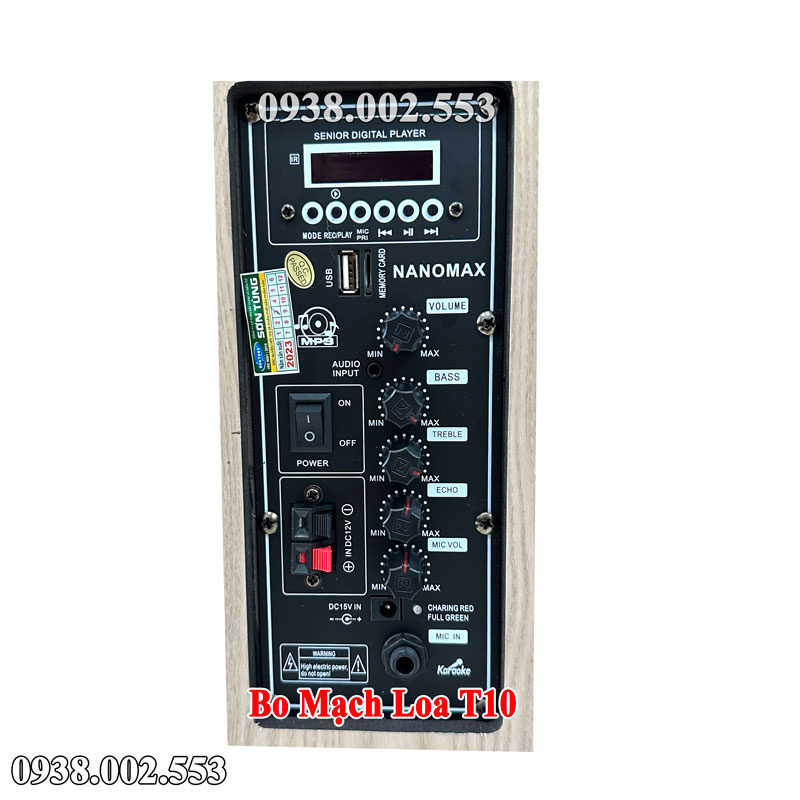 Loa xách tay Nanomax T-10 cũng được trang bị các nút tinh chỉnh cơ bản như: Bass, Treble, Echo, Volume Mic để tùy chỉnh theo sở thích. Thời gian sử dụng của sản phẩm là khoảng 3 ~ 7 tiếng, tùy thuộc vào mức độ âm lượng được sử dụng. Thời gian sạc của sản phẩm là khoảng 4 ~ 6 tiếng, đảm bảo cho bạn có thể sử dụng sản phẩm liên tục mà không bị gián đoạn.