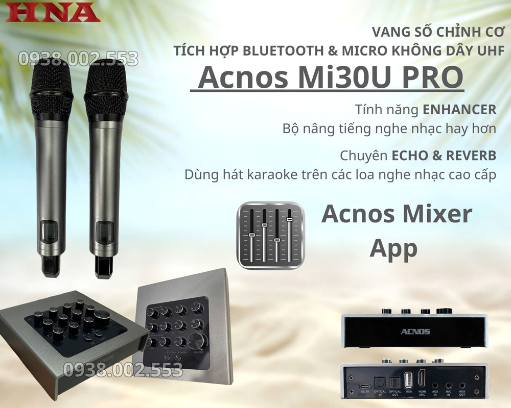 Mẫu vang số chỉnh cơ mới nhất hãng ACNOS Mi30u Pro là phiên bản mới ra mắt của hãng, dựa trên phân bản cũ là Mi30u với thiết kế nhỏ gọn, đầy đủ những nút tuỳ chỉnh hỗ trợ hát karaoke. Bộ mixer Acnos Mi30u Pro có 2 tay micro được thay đổi và nâng cấp sử dụng củ micro cao cấp, nâng giọng hát.